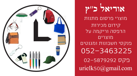 מוצרים עם הלוגו שלכם על המוצר. אפשרי בהדפסה חריטה וריקמה .כגון עטים מחברות צידניות תיקים כוסות ובקבוקים מחזיקי מפתחות מגנטים חולצות כובעים מטענים לטלפון ועוד