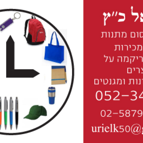 מוצרים עם הלוגו שלכם על המוצר. אפשרי בהדפסה חריטה וריקמה .כגון עטים מחברות צידניות תיקים כוסות ובקבוקים מחזיקי מפתחות מגנטים חולצות כובעים מטענים לטלפון ועוד